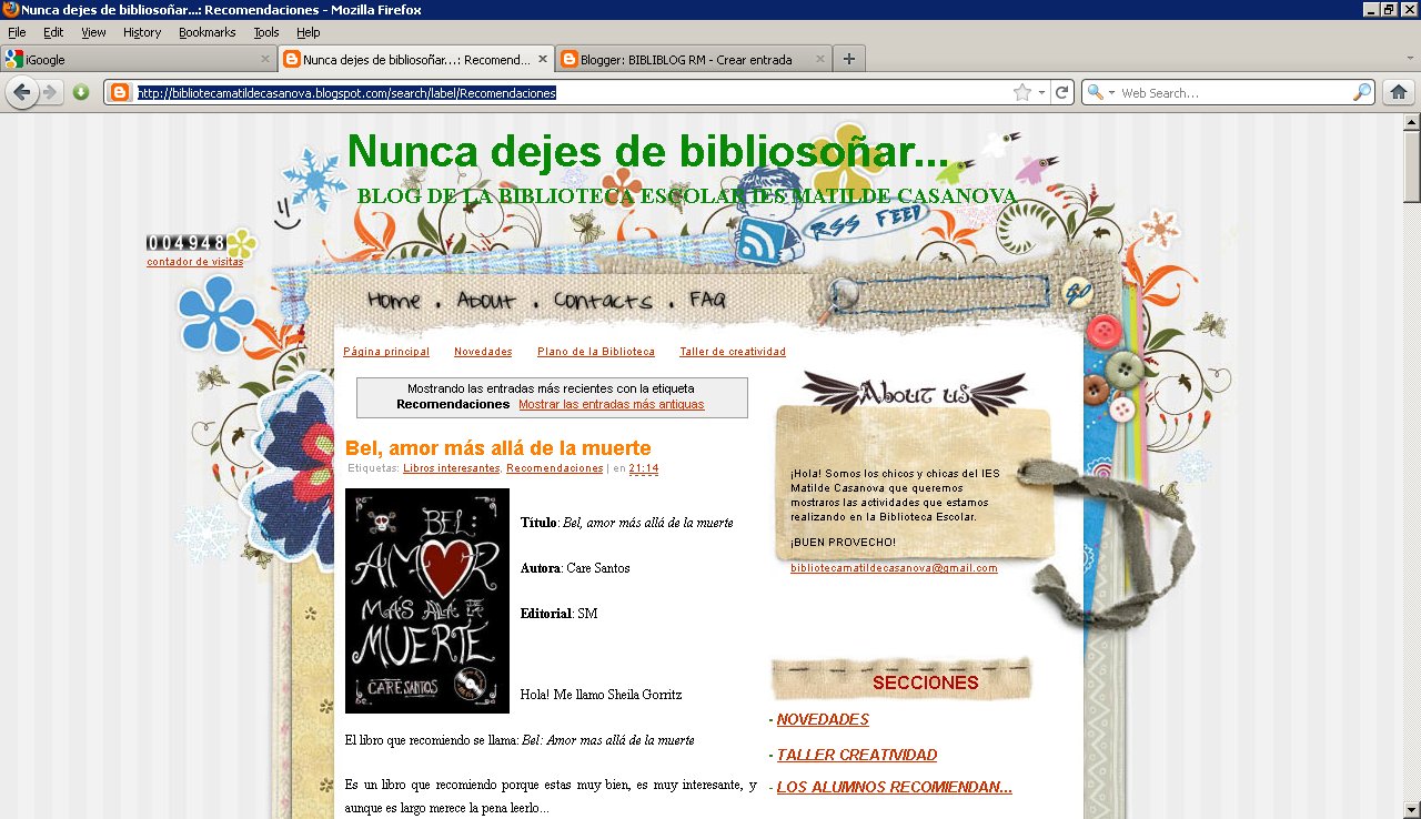 25/04/2011 RECOMENDACIONES DE ALUMNOS Gracias al profesor Nacho Lara, del IES Matilde Casanova nos acaban de llegar recomendaciones de lecturas elaboradas por sus alumnos y alumnas. !Esperamos os sean de interés! La dirección es : Recomendaciones