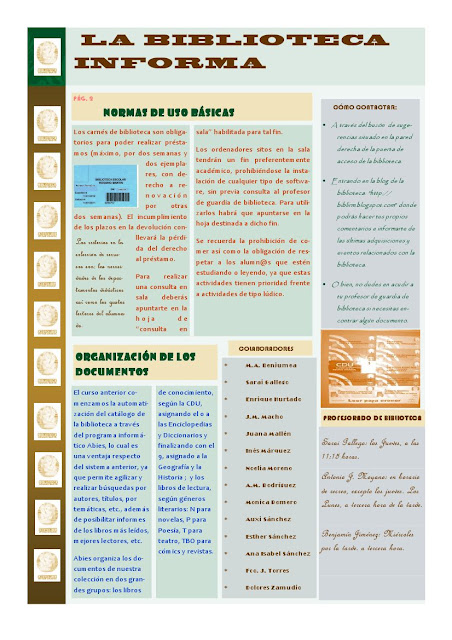 Dentro de unos días verá la luz el número 1 (en realidad, el segundo boletin) de nuestra biblioteca escolar, en el que se os dará información de algunas normas básicas de uso de la biblioteca, las últimas novedades en libros adquiridos, así como las actividades culturales realizadas o que se van a realizar, relacionadas con el mundo del libro. Si no quereis esperar, aquí podeis visualizar cómo sera nuestro boletín.